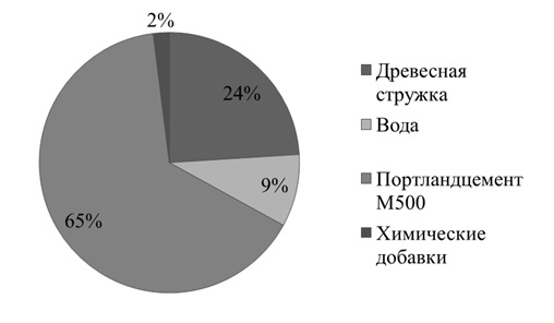 Цементно-стружечная плита (ЦСП) (рис. 4) – это материал, изготовленный путем прессования смеси из цемента, деревянной стружки и химических добавок. Используемым цементом должен быть портландцемент. Состав цементно-стружечных плит представлен на рис. 5. В качестве химических добавок используются: хлорид кальция, «жидкое стекло», хлорид или сульфат алюминия. Они применяются для защиты материала от гниения, поражения грибком, уменьшают способность впитывать воду и увеличивают стойкость к морозу [2]. ЦСП является продуктом российского производства и его стоимость гораздо меньше, чем стоимость несъемной опалубки VELOX. Физико-механические показатели ЦСП представлены в табл. 4.
