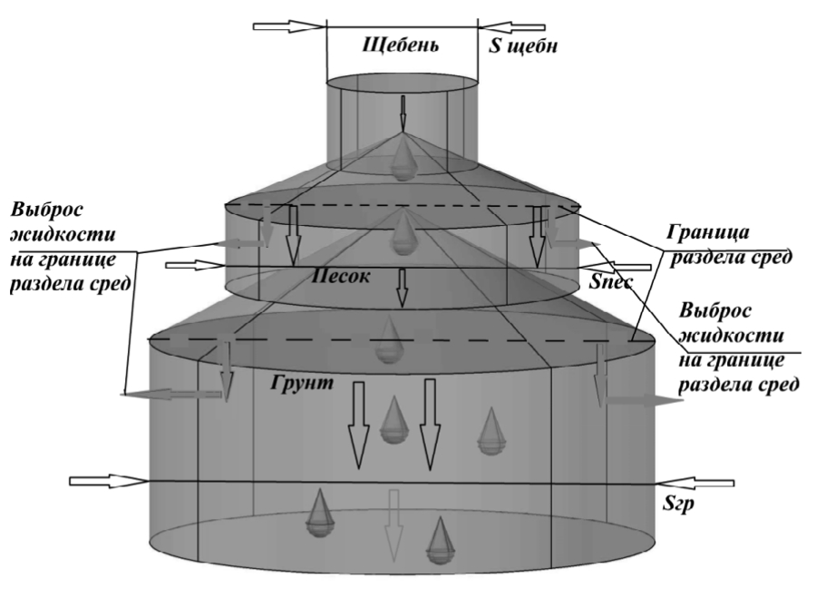 Расстояние (радиус), по которому движется жидкость, зависит от среды протекания и грунтов, соответственно от пористости грунта. Можно сделать вывод об уменьшении радиуса частиц грунта (щебень → песок → грунт), соответственно [2, 6, 7] площадь поперечного сечения трубок тока жидкости в различных средах проходит следующие слои: щебень → песок → грунт (рис. 2).