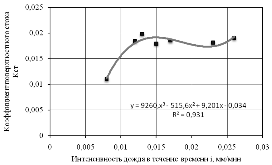 - Установлена зависимость коэффициента поверхностного стока от интенсивности дождя в течение времени y = 9260,x3 − 515,6x2 + 9,201x − 0,034.