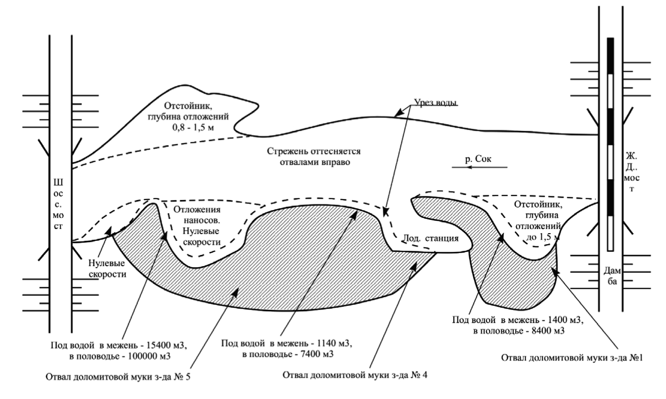 Общий объём отходов дробления, располагаемых вдоль береговой линии р. Сок, в 1979 г. составил 3,9 млн. м3 [2]. За период с 1979 по 1982 гг. отвалы напротив ДСЗ № 4 и №5 продвинулись вглубь реки соответственно на 23 и 66 м.