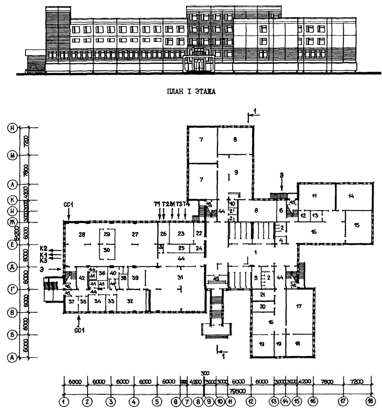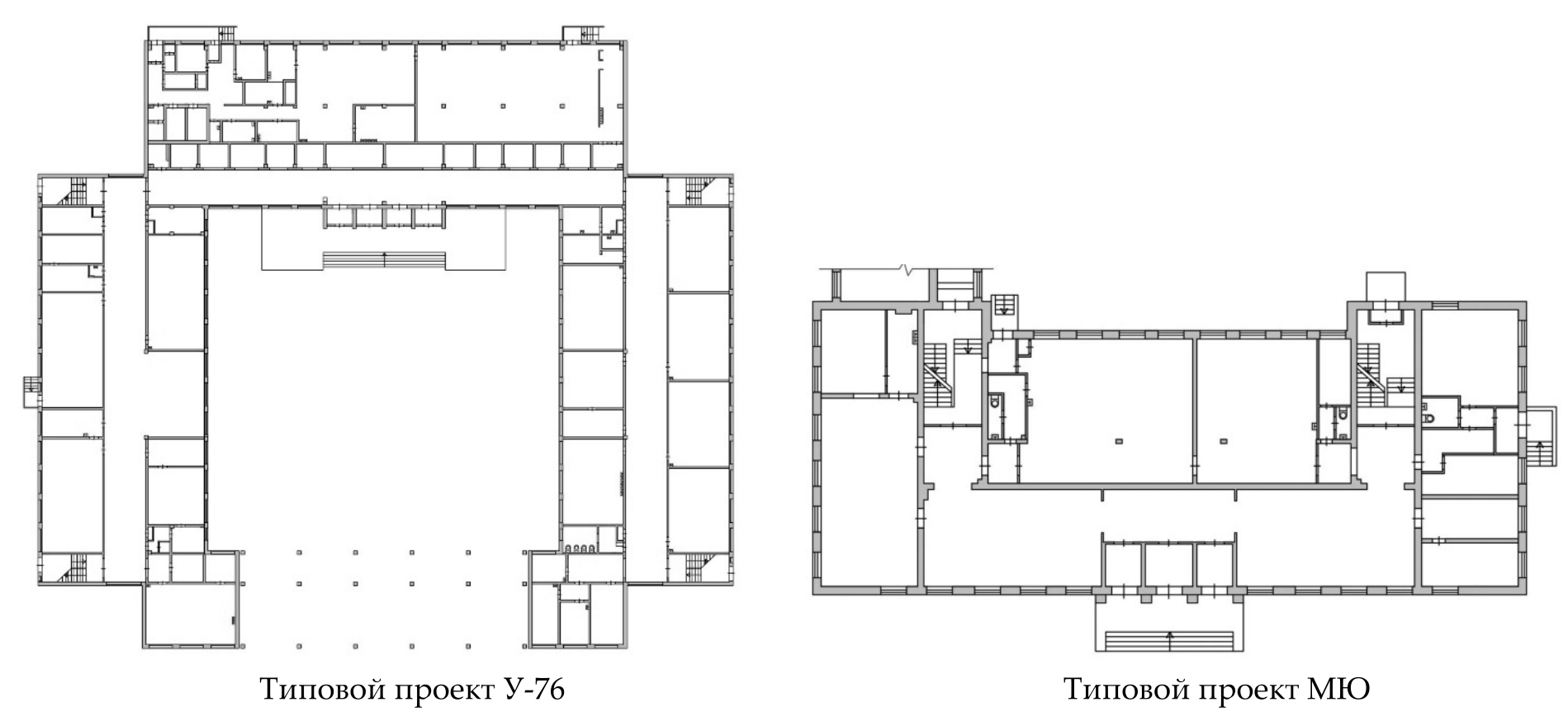 В 1932–1934 гг. в СССР были установлены общие требования к организации учебного процесса, что послужило началом для разработки проектов школьных зданий на 280, 400 и 800 мест. Типовые здания строились в два–четыре этажа. В 1950–1960 гг. началось массовое жилищное строительство, создавались микрорайоны, в которых возводились новые школы. Проекты зданий типа МЮ и 65-426/8 массово применялись в районах с пятиэтажной застройкой. Типовой проект У-76 применялся в районах с 9- и 12-этажной жилой застройкой (рис. 1). Общими характеристиками школ советского периода являются: компактность общих компоновочных решений школьных зданий, повышенная этажность (до 6 этажей в ряде случаев), высокая наполняемость классов (30-40 учащихся) при небольшой общей площади.