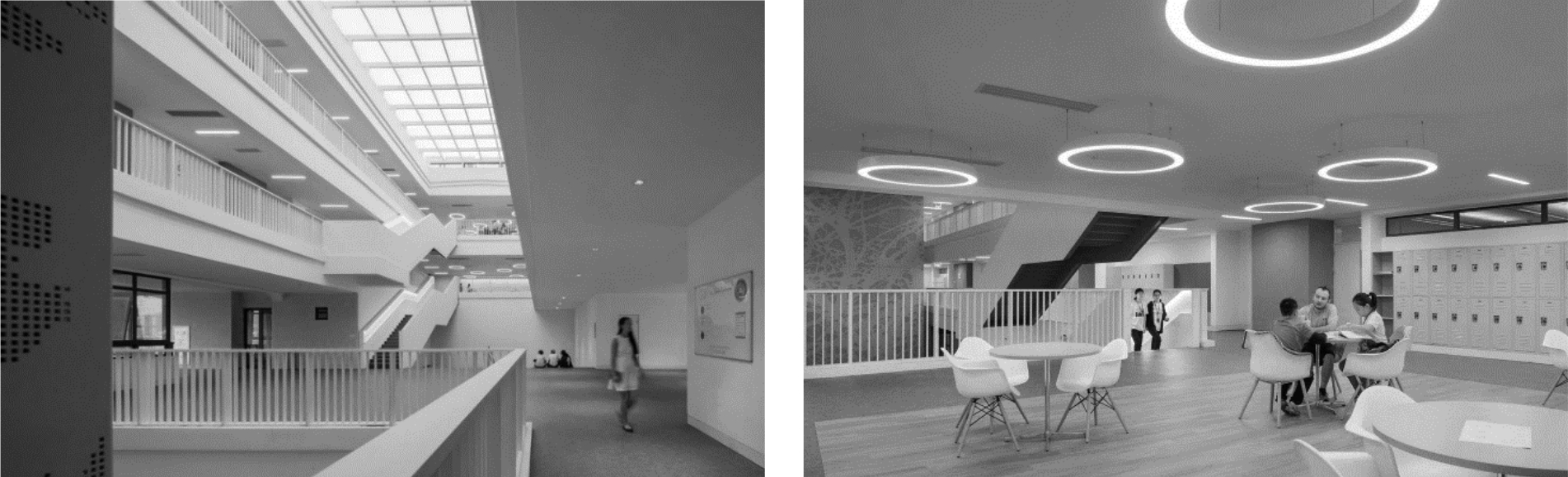 Функциональная структура современного школьного здания сложна и многогранна. В последних проектах можно выделить ряд кластеров: учебный, административный, вспомогательный и общешкольный. Анализ развития последнего из вышеперечисленных представляет наибольший интерес. Включение в структуру общешкольных пространств таких зон, как: лобби, лестницы для сидения, помещения медиатек, зоны для установки локеров, атриумов и трансформирующихся пространств концертных залов, позволяет архитекторам моделировать среды школьного здания с учетом современных потребностей подрастающего поколения. В исследовании особое внимание уделяется трансформации данного типа пространств и их развитию в отечественной практике, начиная с типовых проектов советского периода и заканчивая современными проектами школьных зданий.
