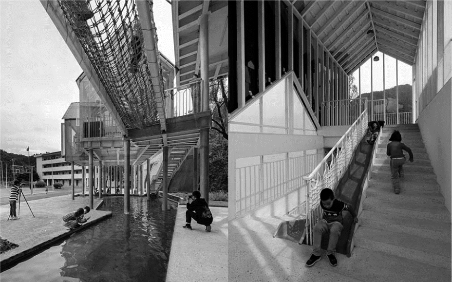 Еще одним из интересных примеров проектирования образовательного комплекса является «Basis International School Park Lane Harbour» в Гуанджоу (Китай). Это школа-интернат, вмещающая 1200 учеников. Площадь застройки составляет 43 000 м², кампуса – 70 000 м². Место кампуса было выбрано в горном лесу на берегу залива Парк-Лейн. Участок покрыт густой растительностью с перепадом высот 58 м, от самого низкого до самого высокого уровня. Между разными высотами существует множество транспортных соединений, что удобно для учителей и учеников в школе. Связи с разными высотными отметками устанавливаются путем полного использования ландшафта участка, что снижает необходимость подъема и спуска. Базисная международная школа состоит из обучающей группы (включая ресторан с обзором на 360 град, крытый спортзал), общежития и спортивной площадки на вершине. Группы общежитий принимают форму башен в стиле рассредоточенных точек [7–10]. По замыслу архитекторов функциональную структуру кампуса можно разделить на две основные группы: базовую среду обучения (с упором на внутренние отношения) и среду межличностного общения (с упором на активный отдых и межличностное общение). Эти две группы определяют внутреннюю и внешнюю среду кампуса. Международные школы применяют модель обучения по выбору класса, и у учащихся нет фиксированной классной комнаты (рис. 6).