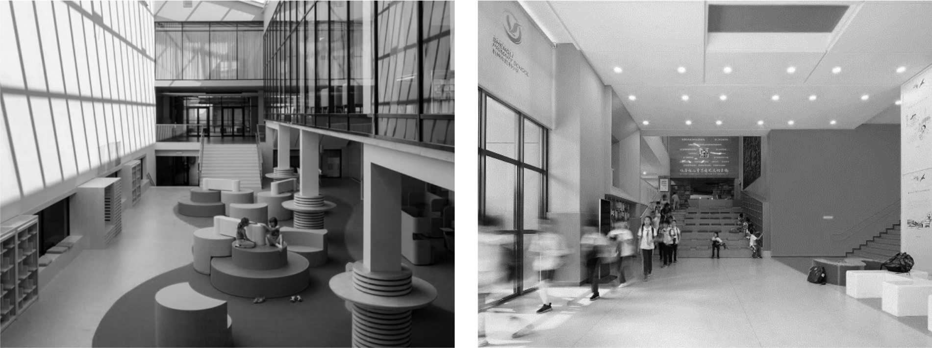В типовых школьных зданиях советского периода общешкольные пространства имели строго утилитарное значение: коммуникацию в вертикальном и горизонтальном уровнях между учебными классами, проведение мероприятий в обособленных пространствах актовых залов, читальных залах в библиотеках, наличие которых зависело строго от вместимости образовательного учреждения.