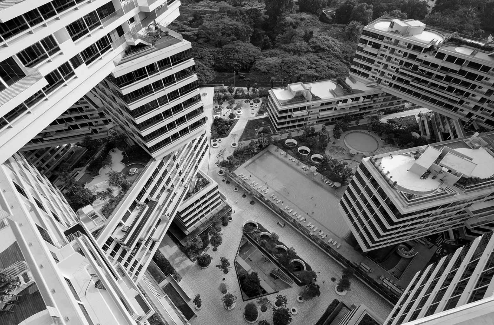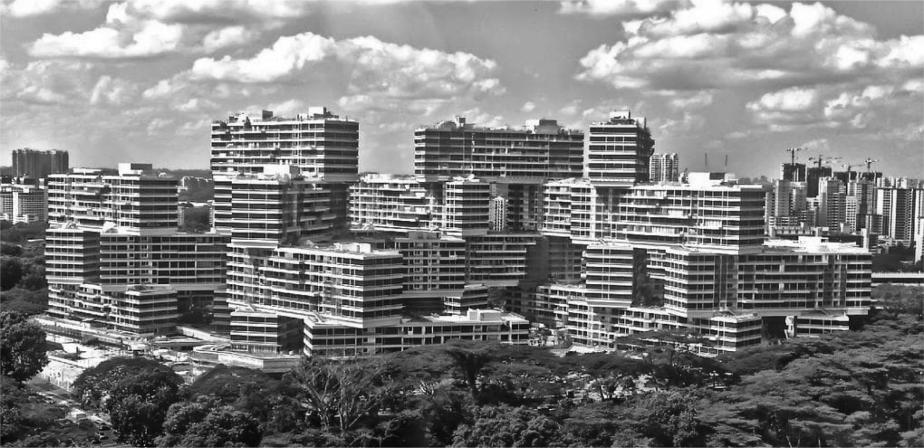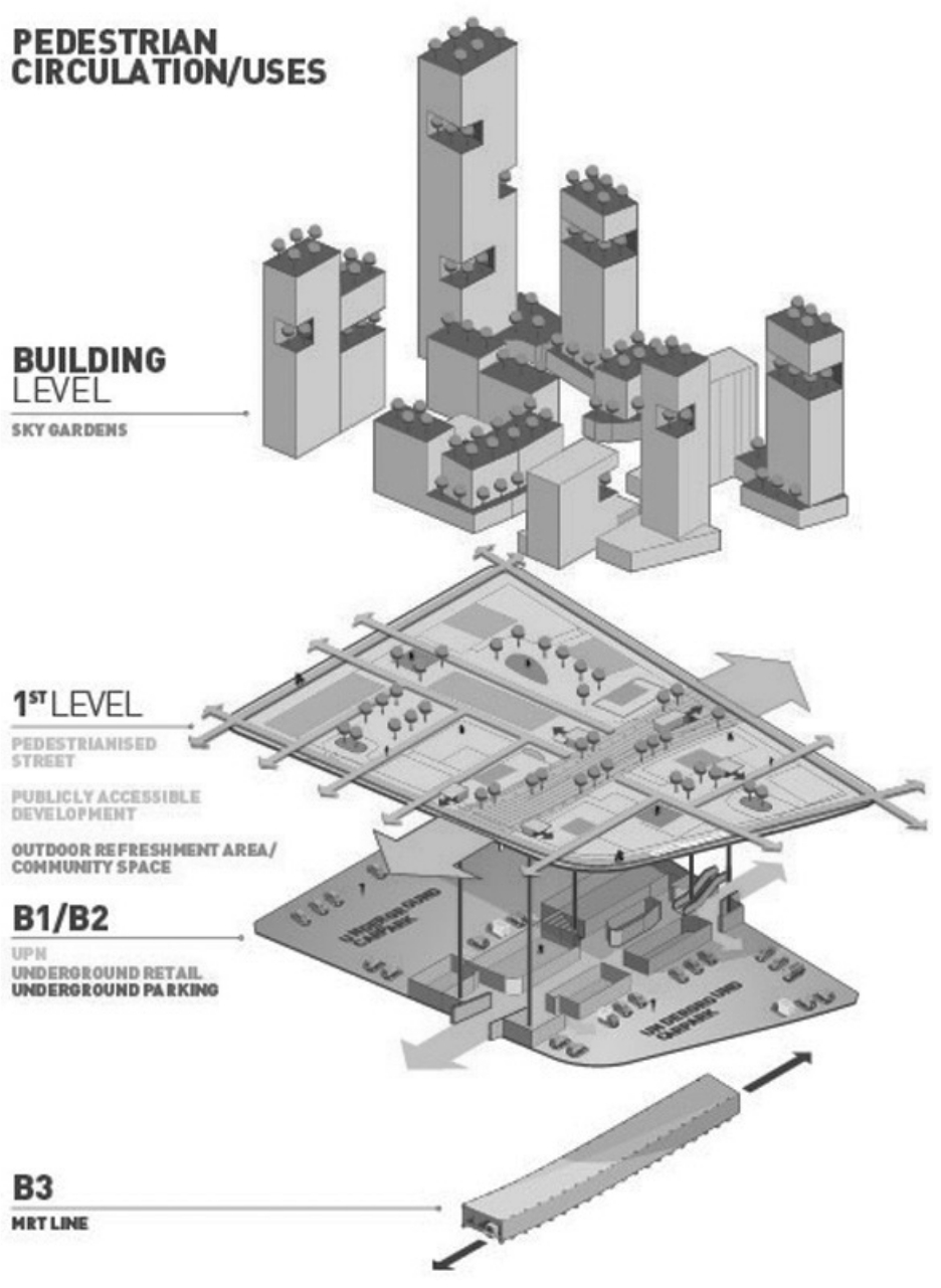 Планировщики городской среды давно поняли, что объединение в одном здании или комплексе базового набора необходимых объектов, например пунктов питания, магазинов и офисов, позволяет решить множество проблем, таких как: растущую нагрузку на транспортную инфраструктуру, хаотичность человеко-потоков и других негативных последствий плотной планировочной структуры. В Сингапуре осмысление важности процессов вертикального зонирования началось несколько десятков лет назад и разрабатывается до сих пор, иногда воплощаясь в уникальных архитектурных решениях. Примером могут служить деловые центры, совмещенные с жилыми блоками со скверами на кровлях, предприятиями питания и торговыми комплексами [1] (рис. 1).
