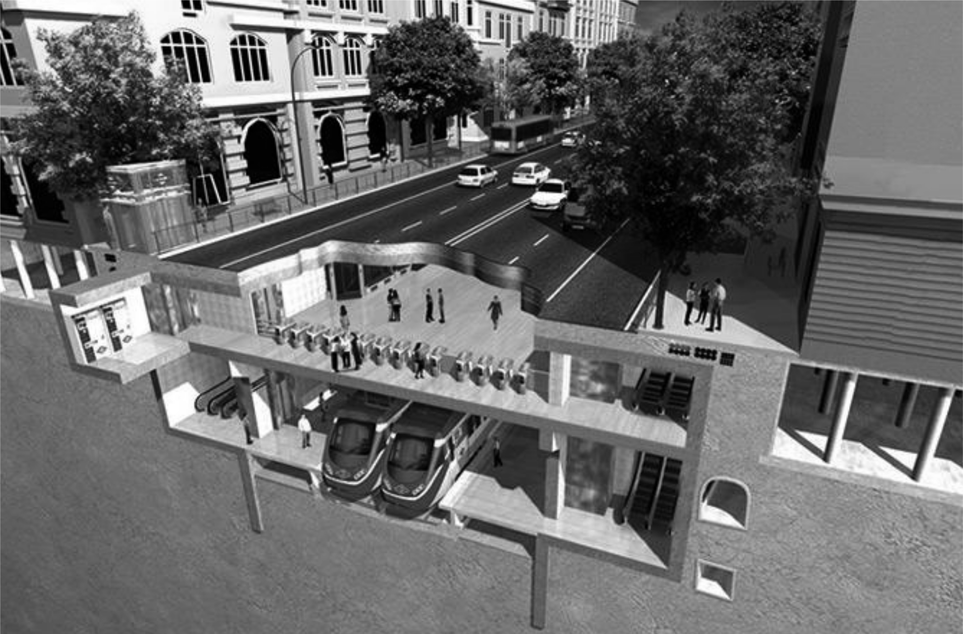 Возведенные по испанской технологии подземные станции обычно имеют два уровня (рис. 6). При этом основной инновацией выступает применение противофильтрационных «стен в грунте», способствующих значительному ускорению строительства объекта [6]. В зависимости от типа горных пород для «стены в грунте» используются либо буронабивные сваи, либо бетонные стены по технологии струйной цементации Jet Grouting, или же традиционный метод создания траншейной завесы, когда грейфер производит выемку грунта до необходимой глубины и в траншею вводятся армокаркасы. После этого через бетонолитные трубы подается бетон определенной марки. Дополнительное усиление «стен в грунте» обеспечивают армокаркасы и обсадные трубы для буронабивных свай, позволяющие максимально повысить несущую способность противофильтрационного сооружения.