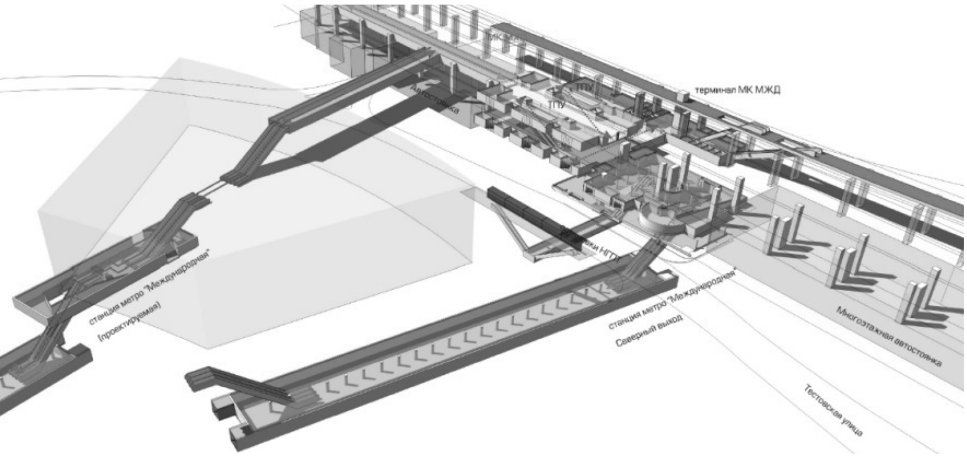 Рядом с Третьим транспортным кольцом строится основной транспортно-пересадочный узел комплекса «Москва-Сити» – IQ-quarter (ТПУ «Сити»). Непосредственно ТПУ «Сити» расположен в 7-этажной подземной части [9]. На -7 уровне проходит Калининско–Солнцевская линия метрополитена (участок до «Парка Победы» открыт в январе 2014 г.), а также линии Третьего Пересадочного Контура, открытие которого состоялось в 2016 г. (рис. 8).