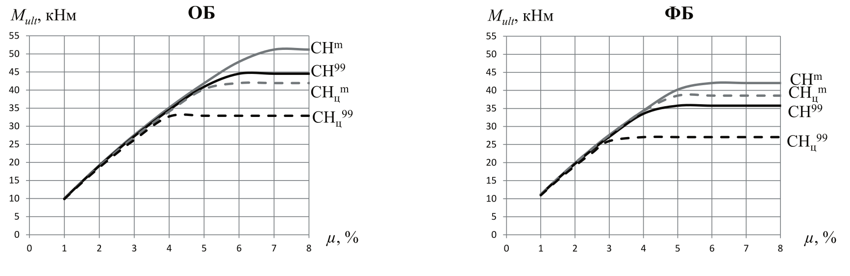 As expected, the kinetics of the bearing capacity of the beams of the series is the same with reinforcement µ under the limit (µR = 2.5 ÷ 3%), since it (per prerequisites (SP 63.13330 “Concrete and reinforced concrete structures”) is determined only by the strength potential of tensile reinforcement. This is also confirmed by the practical identity of changes in indicators of different levels of probability. Notably, in this reinforcement range, the bearing capacity of the beams of the FC series is higher than that of the conventional analogues of relatively lower strength concrete.