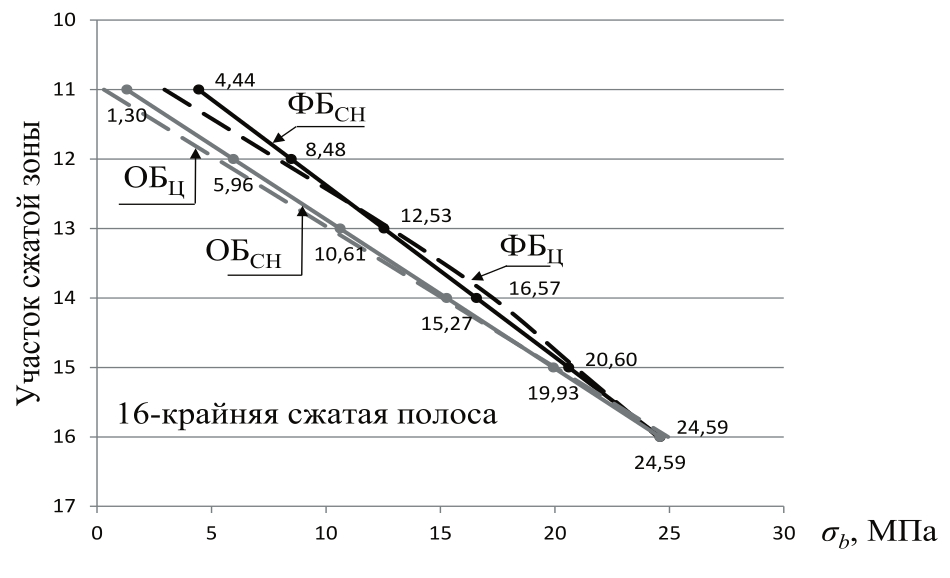 Fig. 3. Layer-by-layer change in the stresses of the compressed zone.