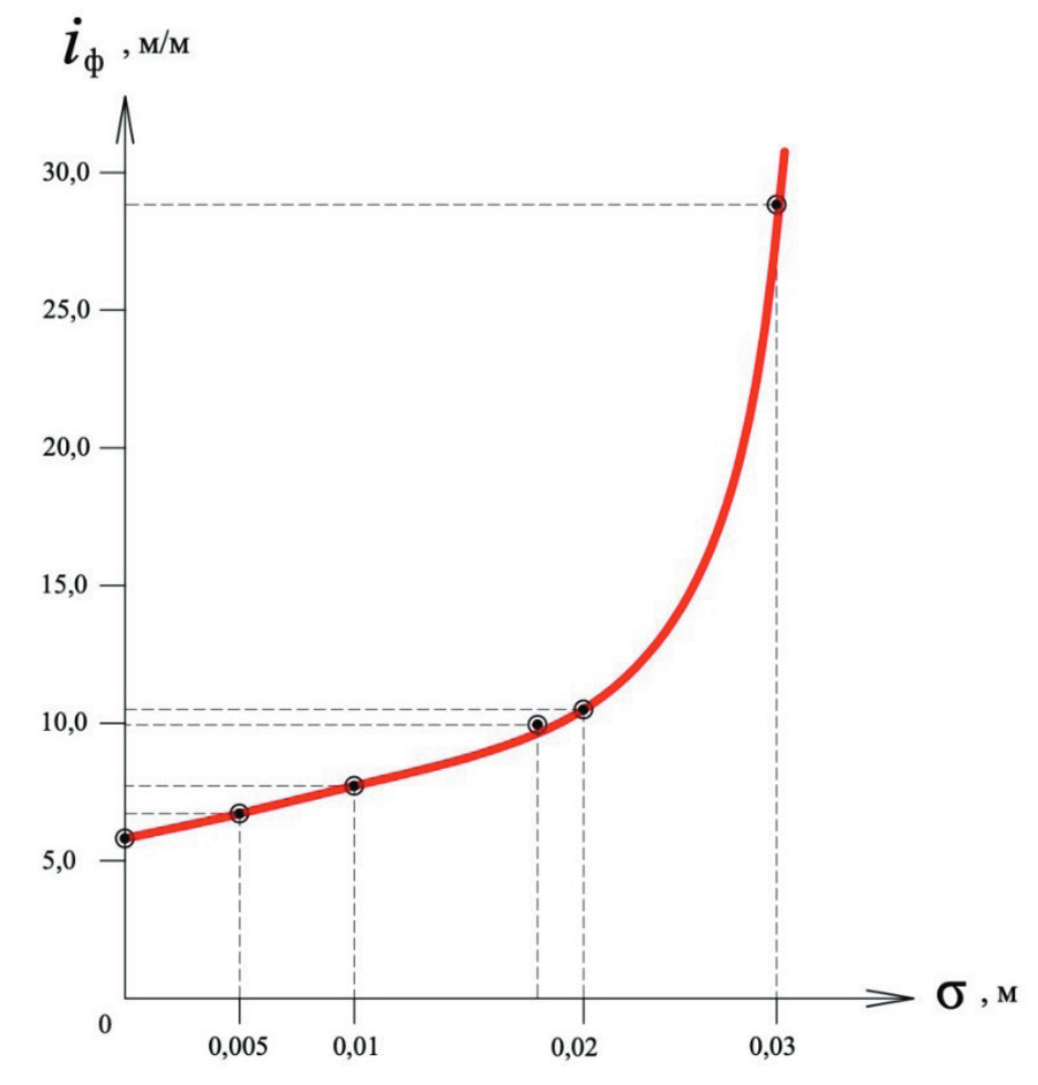 По данным табл. 1 на рис. 3 построен график зависимости =f(σ), подтверждающий, что чем меньше значения фактического внутреннего диаметра в трубах со слоем отложений σ, тем больше значения гидравлического уклона и тем больше значения фактической скорости потока . Это также подтверждается значениями коэффициента гидравлической эффективности трубопровода , характеризующего для приведенного примера влияние толщины слоя внутренних отложений σ на значения гидравлических характеристик трубопровода.