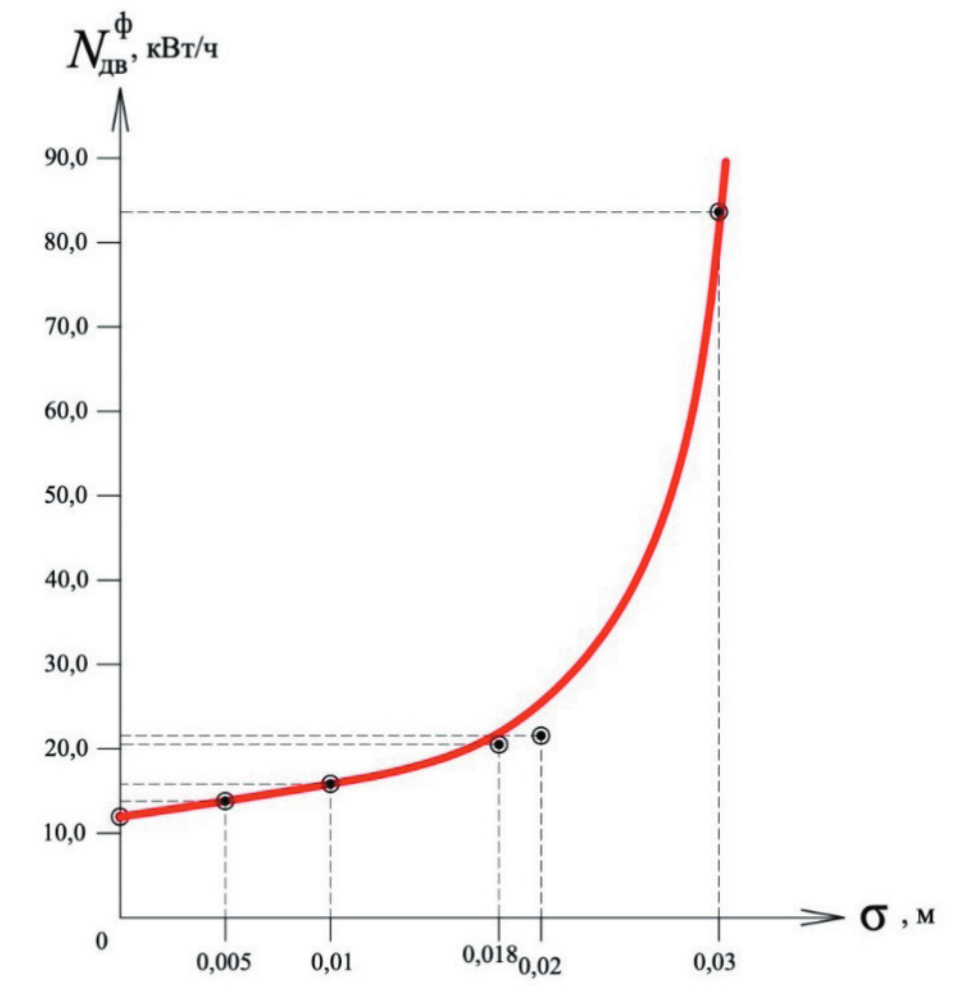 График, представленный на рис. 4 для приведенного примера, подтверждает изменение энергопотребления насосных агрегатов и показывает, что чем больше значение толщины слоя отложений σ, тем больше энергопотребление насосных агрегатов (табл. 2). При значении 0,018 м, фактическое значение энергопотребления насосных агрегатов , установленных в трубопроводе диаметром dн=0,404 м – резко возрастает. Это означает, что в процессе эксплуатации напорных коллекторов из чугунных труб необходимо контролировать фактические значения толщины слоя внутренних отложений σф.