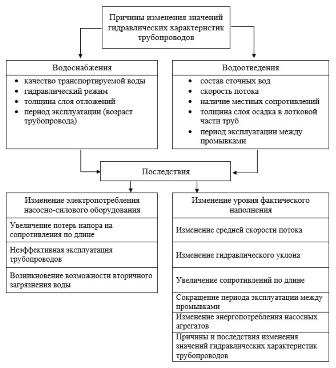 Рис. 2. Причины и последствия изменения значений гидравлических характеристик трубопроводов водоснабжения и водоотведения