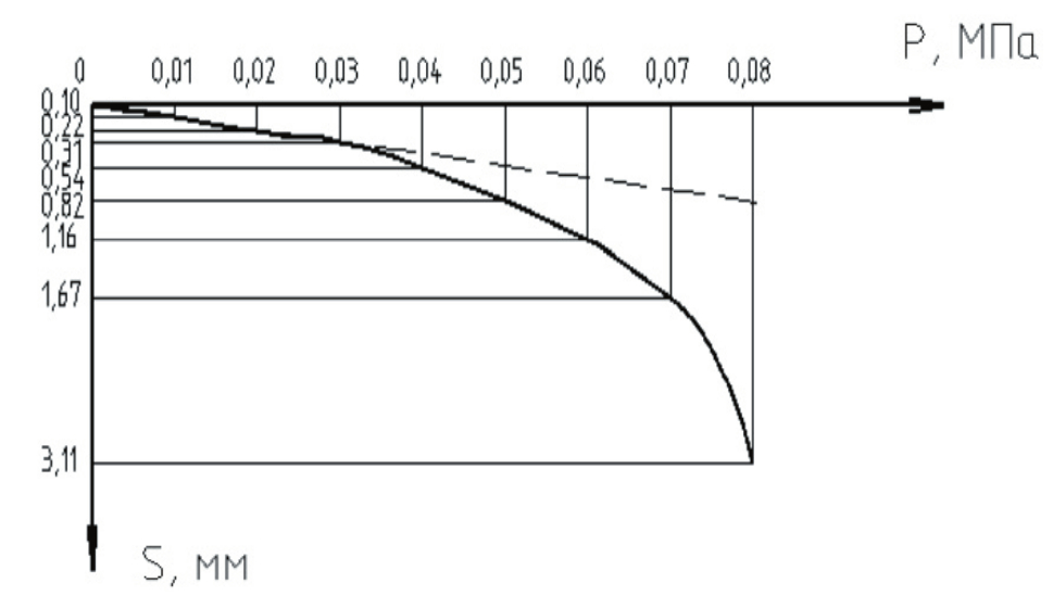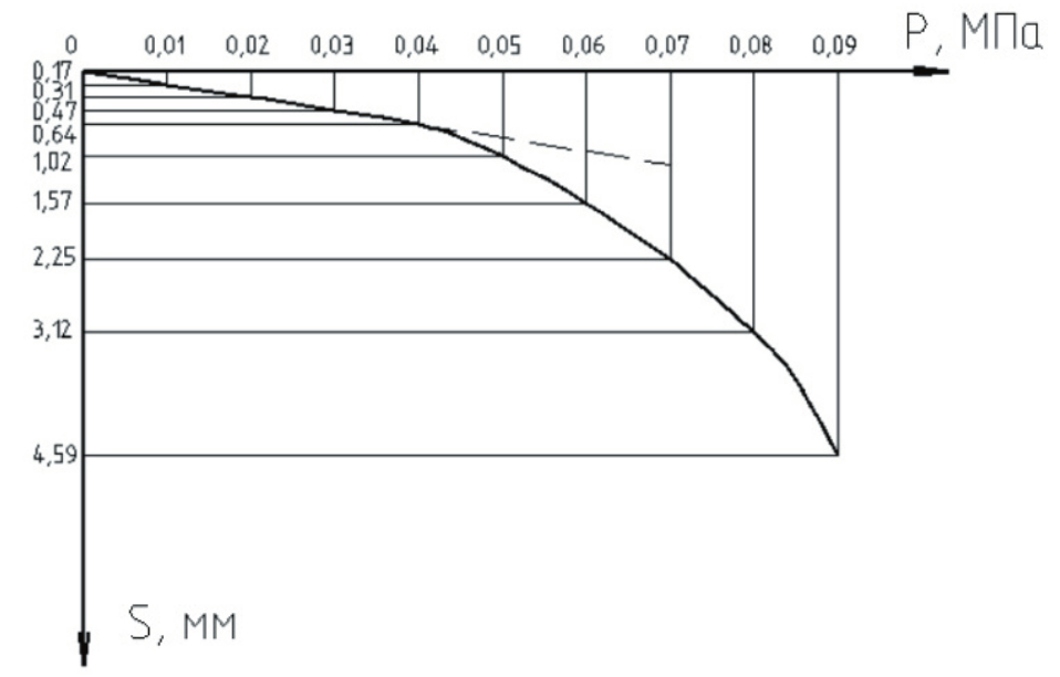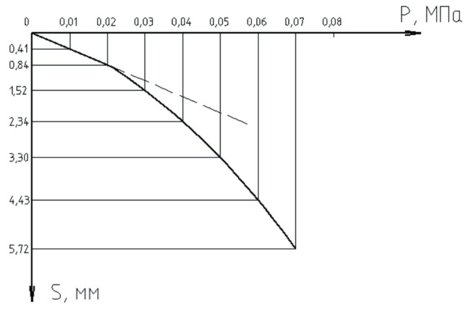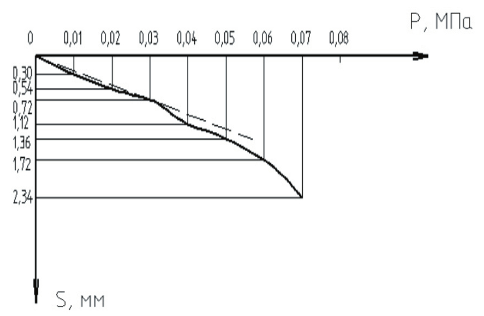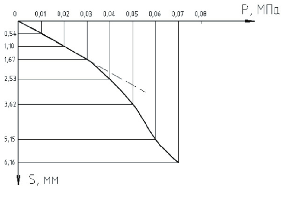 Рис. 3. График зависимости осадки штампа от нагрузки при испытании грунта без армирования