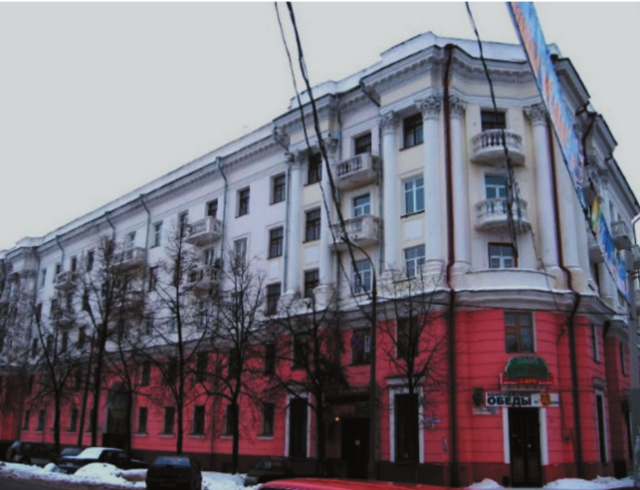 - 64-квартирный пятиэтажный жилой дом горсовета (пр. Ленина, 88; 1953 – начало 1960-х) закрепил перекресток главных улиц города (пр. Ленина и ул. Громобоя). Архитектор и здесь использовал характерные для него решения: акцентирующие углы здания ризалиты со сдвоенными пилястрами, в том числе оформленные композитным ордером с каннелюрами, рустовку нижних ярусов здания. Как отголосок идеи дома И.В. Жолтовского на Смоленской площади в Москве (1952) на фасаде появился ритм декоративных «пятен», артикулирующих фронтальную композицию главных фасадов (рис. 10);