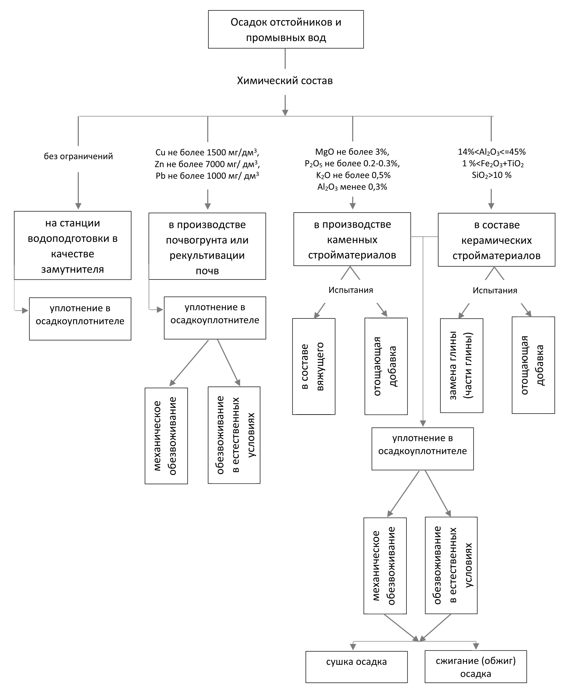 Совместное решение представленных уравнений модели обеспечивает полное описание процесса от момента образования сбросных вод влажностью 99,5–99,7 % до обезвоживания при конечной влажности ≈60 %. Утилизацию осадка также нам не удалось описать математически, поэтому разработан алгоритм принятия решения о направлении утилизации (рис. 2). Исследовав химический состав осадка и воспользовавшись предложенным алгоритмом, представляется возможным принять обоснованное решение о направлении(ях) утилизации осадка, учитывая заинтересованность потенциальных потребителей.