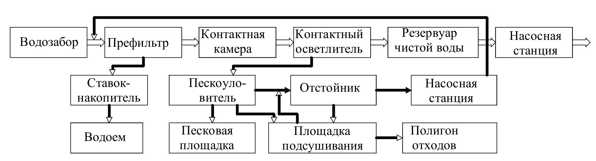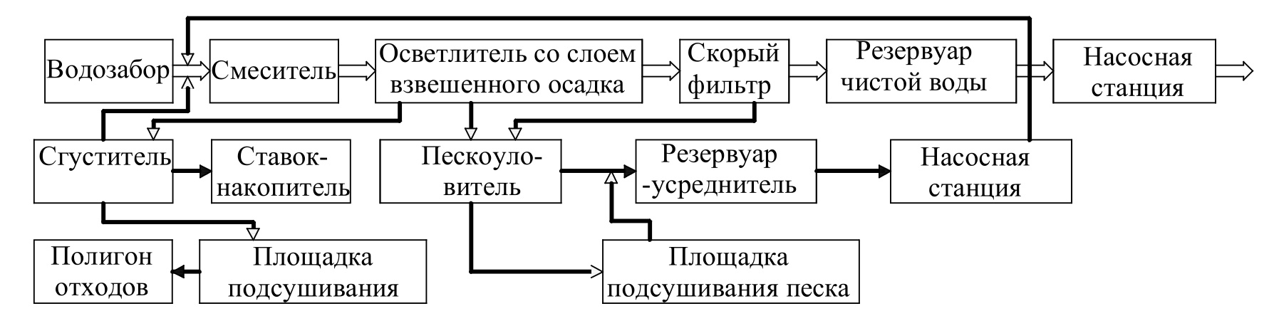 - по второй схеме (рис. 3) промывную воду после осветлителей со слоем взвешенного осадка и скорых фильтров, осадок из сооружения первой ступени направляют в сгустители, затем на площадки подсушивания и на полигон отходов. Осветленную воду из сгустителя перекачивают в смеситель или в пруды-накопители. Грязная промывная вода после резервуара-усреднителя поступает в смеситель ВОС;