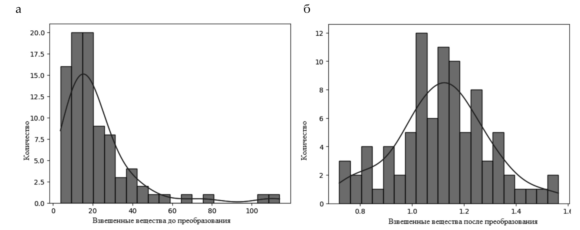 Для построения более адекватных моделей регрессии для всех веществ предварительно были удалены нетипичные данные («выбросы»). Так как распределения концентрации веществ имеют ярко выраженную асимметрию, предварительно с помощью логарифмического и линейного преобразований они были приведены к симметричной форме.