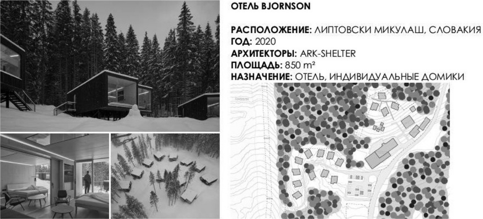 Отель Bjornson (рис. 3) построен в Словакии в 2020 г. архитектурным бюро Ark-shelter. Домики представляют собой двухместные номера, которые ориентированы на солнечную сторону и размещены среди деревьев так, чтобы сохранить естественную среду. Также используется высокий приподнятый цоколь для минимального воздействия на землю. Дома состоят из двух независимых модулей, каждый из которых имеет прихожую, ванную, гостиную, спальню и детскую комнату. Возможно соединение отдельных модулей в один, раздвинув перегородку в гостиной, тем самым создав просторное общее пространство. Рядом располагаются здания с рестораном, сауной и комнатой отдыха с массажным кабинетом [9].