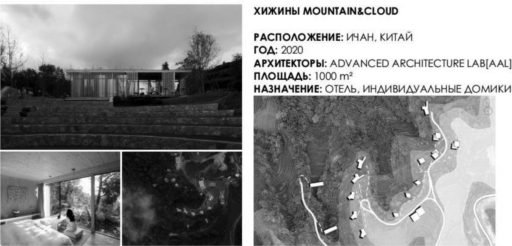 Хижины Mountain&Cloud (рис. 4) спроектированы и построены архитектурным бюро Advanced Architecture Lab в 2020 в городе Ичан, Китай. Проект состоит из 18 деревянных зданий: гостиничные номера площадью от 35 до 65 м2, кафе и бассейн. Деревянные домики установлены на столбчатом фундаменте, чтобы минимизировать ущерб ландшафту. Некоторые номера имеют камины для более комфортного отдыха. Интерьер выполнен в скандинавском стиле и основан на оригинальной текстуре древесины, чтобы создать естественную природную атмосферу. Общая композиция отеля и территории максимально подчинена рельефу местности и окружающей среды [10].