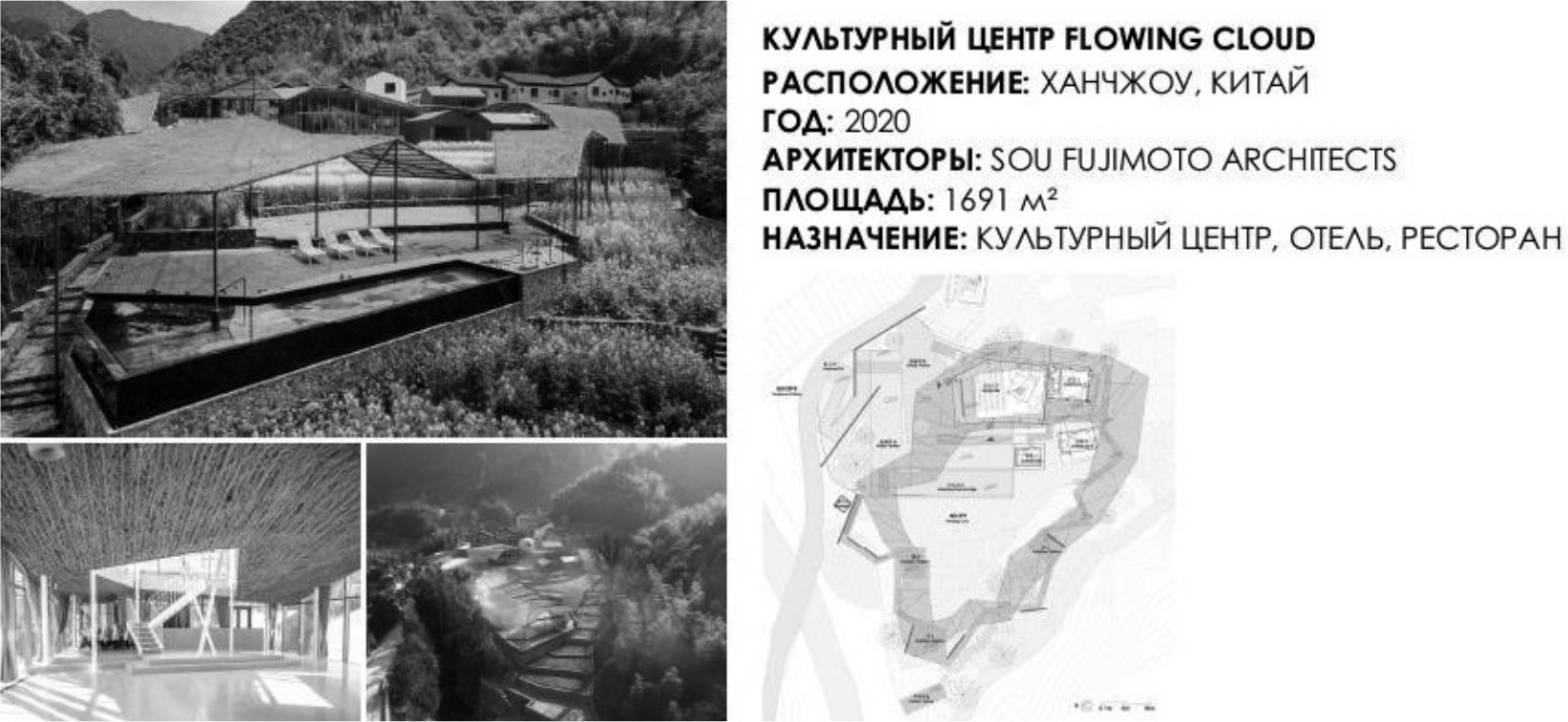 Культурный центр Flowing Cloud (рис. 6) спроектирован в 2020 г. архитектурным бюро Sou Fujimoto Architects в городе Ханчжоу, Китай. Проект состоит из четырех отдельных зданий, главное из которых представляет собой открытое пространство для проведения выставок, конференций, и трех жилых домиков. Здания имеют большие оконные проемы, открывающие прекрасные виды на горные пейзажи. На территории отеля спроектирован легкий навес, напоминающий облако. Навес начинается от главного здания и заканчивается у берега реки, что создает ощущение непрерывности, естественности и слияния с окружающей природой. Идея проекта была навеяна самим местом, особенно туманами и облаками, рассеивающимися над деревней [12].