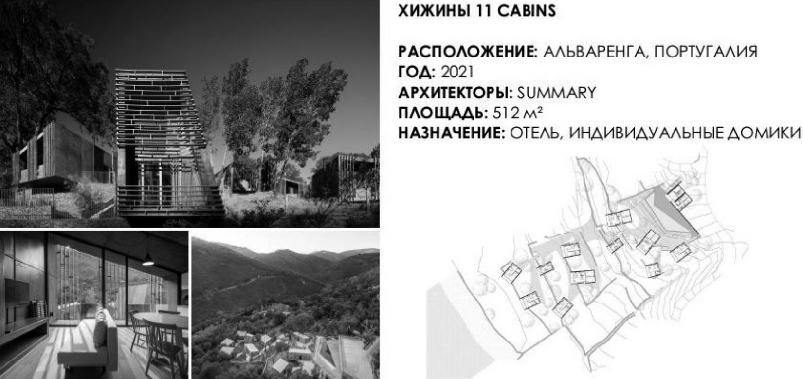Проект хижин 11 Cabins (рис. 9) был создан в 2021 г. архитектурным бюро Fernando Guerra | FG+SG в Альваренга, Португалия. Учитывая неровность и удаленность этого участка, были использованы сборные конструкции как единственный эффективный способ для строительства в таких непростых условиях. Комплекс состоит из одиннадцати небольших домиков, включающих гостиничные номера площадью от 28 до 58 м2. Они распределены по участку в соответствии с естественным рельефом, как можно меньше нарушая его. Сочетание такого, казалось бы, произвольного расположения с различной ориентацией позволило домам не загораживать вид друг на друга, на окружающие лес и реку [15].