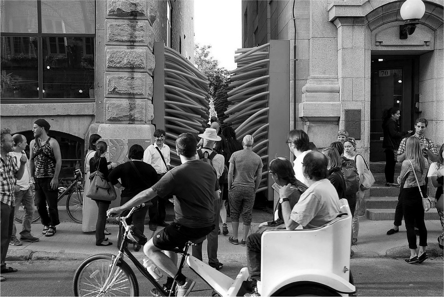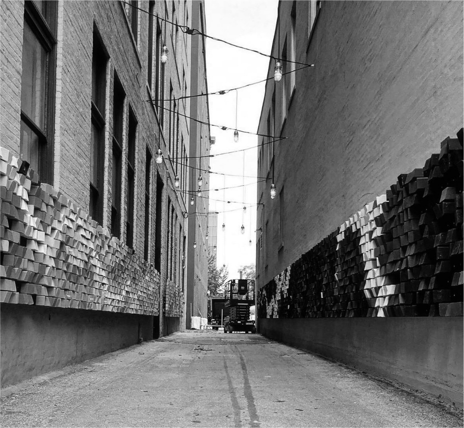 Примером может служить разработанный в 2018 г. дизайнерами Карсон Смэтс, Ноа Юнс и Дженни Хизер интерактивный арт-объект «Нейронная аллея» (рис.3). В переулке на торцах зданий по обе стороны были размещены «холсты» с разноцветными деревянными кубиками, имитирующими пиксели. Прохожие взаимодействовали с инсталляцией, переставляя «пиксели»: создавали различные изображения, оставляли друг другу послания, фотографировались на её фоне и даже проводили различные мероприятия (устраивали прием Санта-Клауса, временный кинотеатр, делали предложения руки и сердца и т. п.). На протяжении шести месяцев камеры фиксировали происходящие события. Затем оцифрованный каталог был доступен для общественности в режиме онлайн.