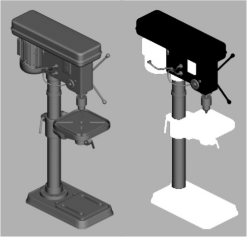 В правой части рис. 2 показано разделение сборных элементов сверлильного станка. Несущий каркас, электродвигатель, механические системы и электрика не требуют участия дизайнера. Дизайнер при разработке такого станка может проектировать только корпус изделия («форма свободного выбора», выделена чёрным). Разработка основания, подвижного стола, корпуса двигателя и кнопок управления может быть доработана дизайнером, но возможности композиционной переработки этих форм существенно ограничены техническими параметрами («формы ограниченного выбора», выделены белым).