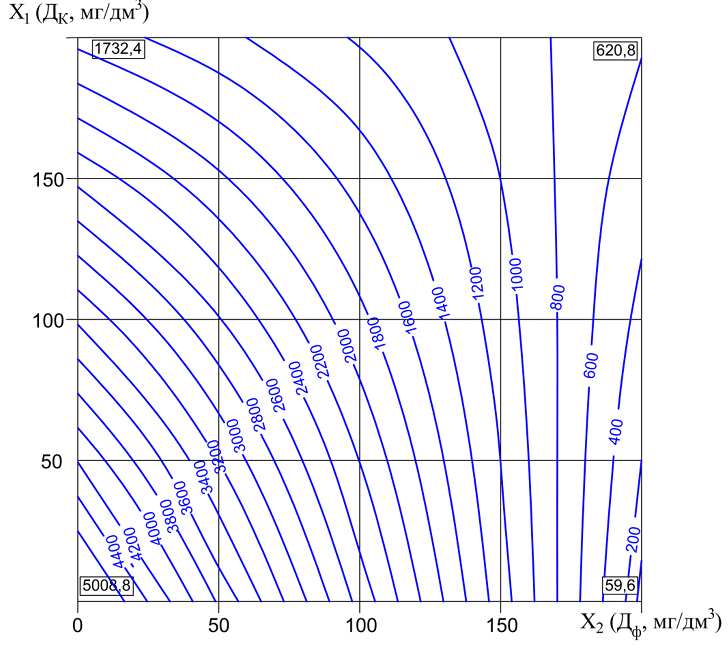 Рис. 1. Изолинии зависимости изменения удельного сопротивления исследуемого осадка r·10-10, см/г, от доз реагентов Дк = 0–200 мг/дм3 и Дф = 0–200 мг/дм3