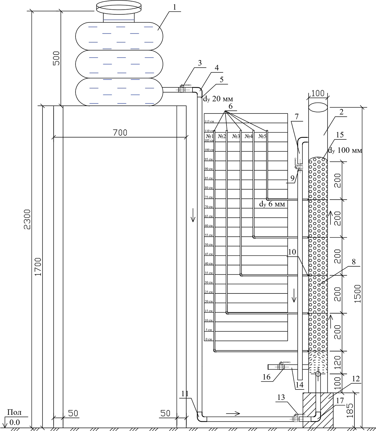 Fig. 1. Experimental stand of filter plant: 1 ‒ tank with source water; 2 ‒ filter column, dy100 mm; 3 ‒ ball butterfly crane; 4,11,17 – 90 deg angle; 5 ‒ a pipeline for supplying source water to the filter column; 6 ‒ piezometer tubes; 7 ‒ pipeline for removal of clarified (filter) water; 8 ‒ filter loading of polystyrene foam; 9,13,16 ‒ plastic ball valve; 10 ‒ connector (5 pcs.); 12 ‒ wooden beam; 14 ‒ pipeline for complete emptying of the plant; 15 ‒ filter screen