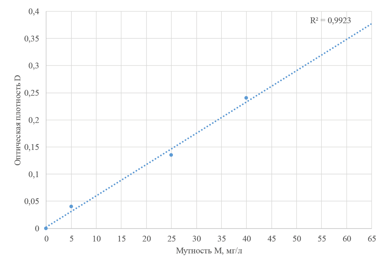 Результаты обора проб воды показывают, что исходная вода, прошедшая через фильтровальную загрузку, осветлилась и на выходе обладала меньшей концентрацией взвешенных веществ, чем при задержании в межзерновом пространстве и на поверхности загрузки взвешенных веществ. Оценку качества фильтрата проводили фотоэлектроколориметрическим методом, согласно которому между оптической плотностью жидкой среды и концентрацией вещества в растворе существует прямая пропорциональная зависимость. Для возможности применения фотоэлектроколориметра (ФЭК) и определения количества остаточных загрязнений веществ в жидкости предварительно было необходимо составить калибровочный график, показывающий зависимость оптической плотности раствора D от мутности или количества загрязняющих веществ в растворе (рис. 5), с нанесенной линией аппроксимации, которой соответствует коэффициент корреляции R = 0,996, что отражает сильную корреляционную связь.