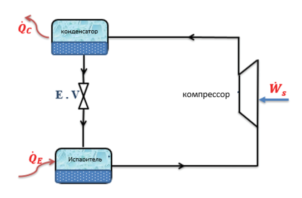 Растущий спрос на энергию предвещает, с одной стороны, резкое сокращение запасов ископаемого топлива, а с другой – чрезмерное потребление этих источников привело к многочисленным экологическим проблемам, заставив весь мир искать альтернативные и, желательно, возобновляемые источники энергии. Одним из наиболее важных из этих источников является солнечная энергия, которая характеризуется способностью покрывать различные нагрузки, как тепловые, так и электрические [1, 2]. Например, системы кондиционирования и охлаждения, работающие с использованием парокомпрессионных холодильных установок, потребляют электрическую энергию [3]. В больших количествах используемые в них хладагенты оказывают вредное воздействие на окружающую среду, особенно на озоновый слой. Парокомпрессионная холодильная машина состоит из четырех основных элементов, как показано на рис. 1: компрессора, конденсатора, испарителя и расширительного (терморегулирующего) клапана. Контур работает на двух уровнях давления: низком (давлении испарения) и высоком (давление конденсации).