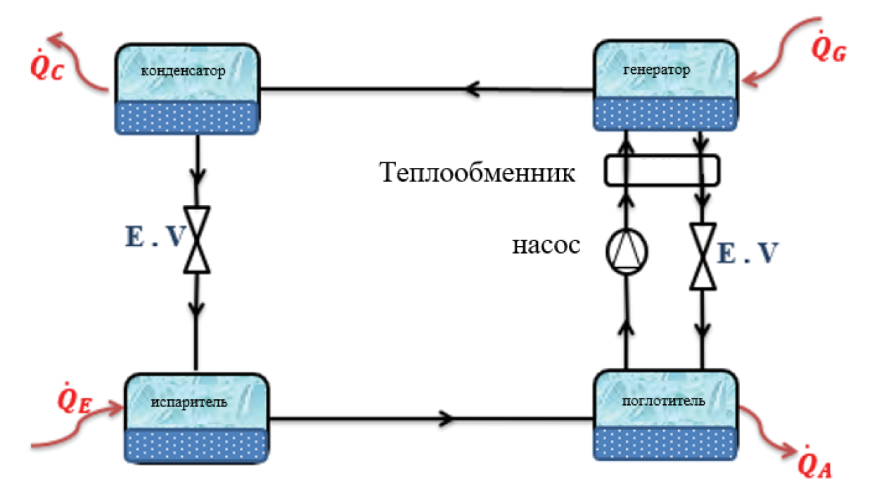 Рис. 2. Схема одноступенчатой абсорбционной холодильной машины