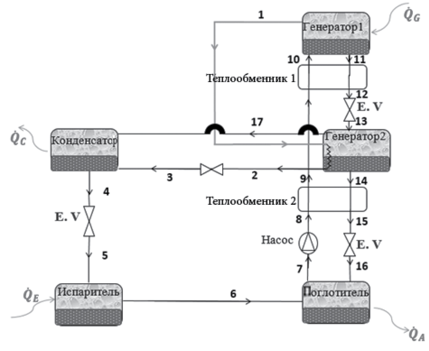 На рис. 3 показана принципиальная схема двухступенчатой абсорбционной холодильной машины, работающей на растворе воды и бромида лития. Машина работает при трех давлениях контура: низком давлении (давление испарения), среднем (давление конденсации) и высоком (давление вторичного генератора). Схема состоит из нескольких сосудов, в которых происходят различные процессы массо- и теплообмена: главный генератор – генератор 1, вторичный генератор 2, абсорбер, испаритель, основной теплообменник и вторичный генератор, насос и расширительный клапан [6, 7]. Раствор нагревается в главном генераторе, богатом газообразным хладагентом, что приводит к выделению паров хладагента в точке (1) при высокой температуре, используемой для нагрева раствора. Он возвращается от основного генератора в точке (11) к вторичному генератору, и таким образом дополнительный охлажденный пар высвобождается в точке (17), затем он конденсируется в конденсаторе, в то время как пар, вырабатываемый основным генератором, конденсируется во вторичном. Его объем добавляется к количеству, выделяющемуся во вторичном генераторе, и общий объем после конденсации в точке (4) поступает в испаритель для получения необходимого количества холода.