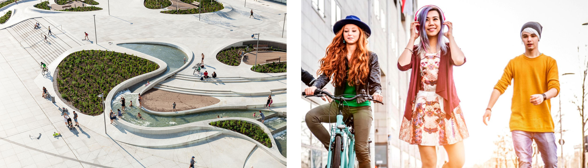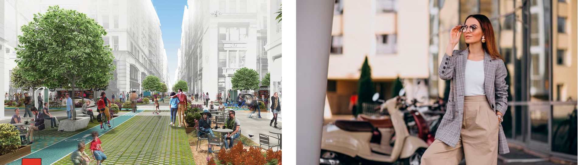 Рис. 4. Примеры дизайна городского пространства и дизайна одежды, сформированные под влиянием урбанистических принципов эффективности, соблюдения человеческого масштаба и сбалансированного движения