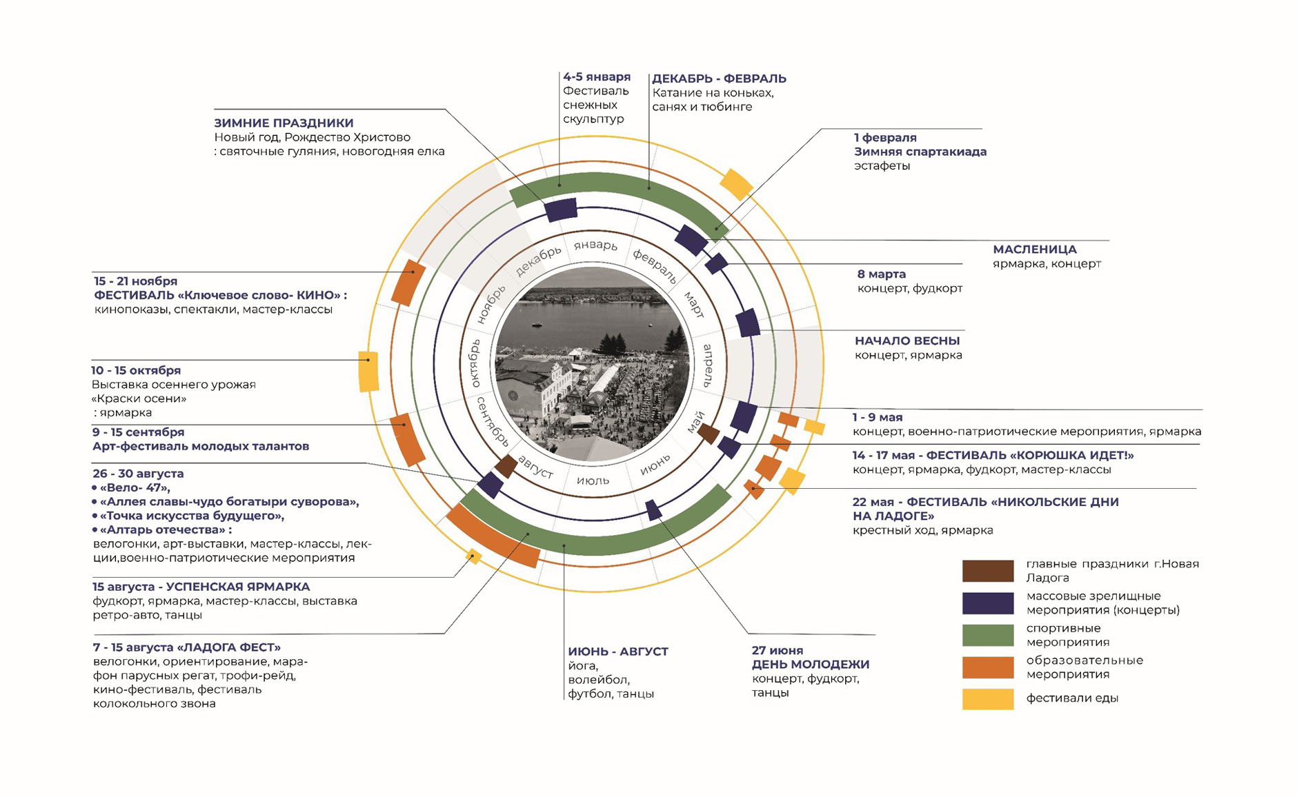Разработан всесезонный календарь событий городского и регионального значения, который включает мероприятия, привлекательные для населения и туристов, как общего характера (зимняя спартакиада, масленица, арт-фестиваль молодых талантов и пр.), так и выявляющие идентичность среды (фестивали «Корюшка идет!», «ЛАДОГА ФЕСТ», «Никольские дни на Ладоге», «Ключевое слово «КИНО»») (рис. 6). Развитие туристической инфраструктуры, активизация культурной и событийной жизни города в соответствии с имеющимся календарем событий, реконструкция канала и благоустройство набережной, реорганизация транспортной структуры города, восстановление рыболовных традиций будут способствовать позиционированию исторического наследия города.