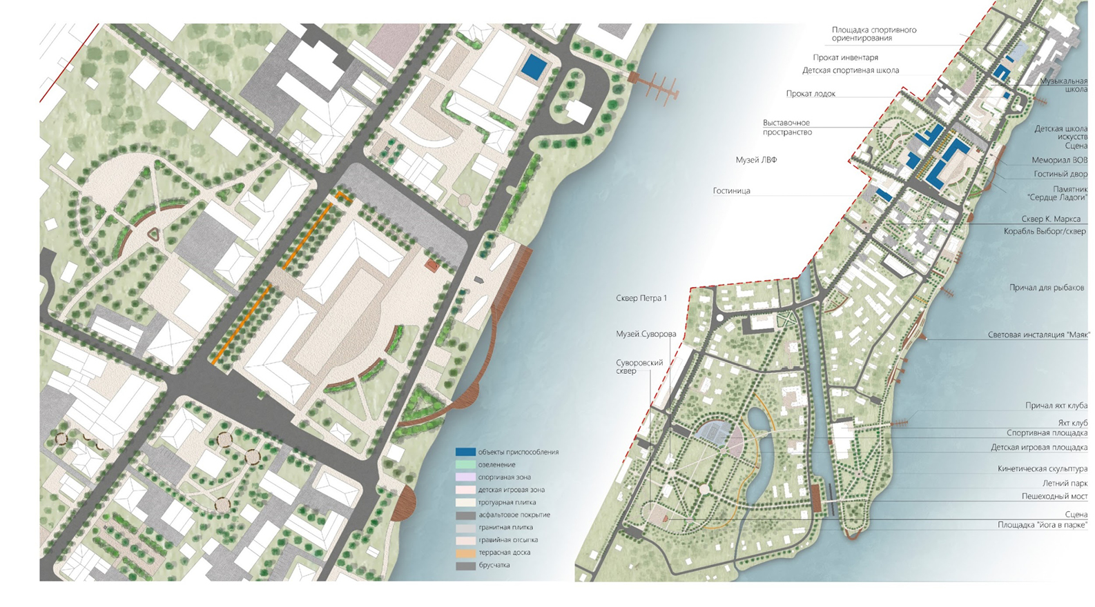 Для формирования уникального культурно-образовательного кластера города мастер-планом предлагается музыкальную, спортивную и художественную школы разместить в непосредственной близости от общеобразовательной школы, городской библиотеки, краеведческого музея и дома культуры, а также создать музей Ладожской Флотилии. Это сформирует целостную городскую среду и будет способствовать сохранению и восстановлению объектов культурного наследия, которые находятся в неудовлетворительном состоянии. На сегодняшний день в городе функционирует два дошкольных образовательных учреждения: Новоладожская средняя общеобразовательная школа имени вице-адмирала В. С. Черокова и Новоладожская детская школа искусств. К объектам культуры относятся: Центр культуры, спорта и туризма, который объединяет городскую библиотеку и Дом культуры; Отдел детского творчества Дворца детского творчества Волховского муниципального района; музей А. В. Суворова, посвящённый командованию Суздальским пехотным полком в 1763–1769 гг. и его квартированию в городе [15]. Предлагается благоустройство набережной с рядом точек притяжения, которое позволит обеспечить связную целостную систему общественных пространств общегородского и регионального уровней (рис. 8).