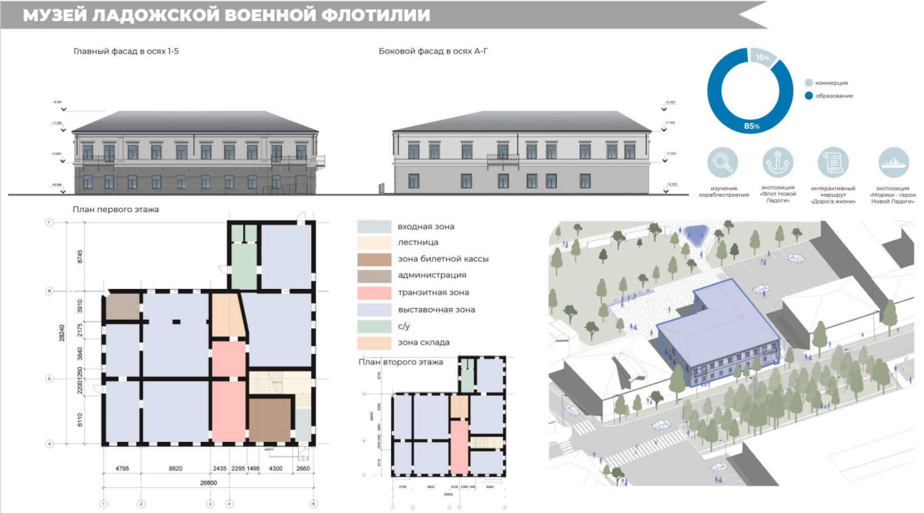 - В доме, расположенном по ул. Карла Маркса, 30 предлагается организовать музей Ладожской военной флотилии, так как ранее там находился штаб Ладожской военной флотилии. Дом расположен в непосредственной близости от Гостиного двора и будет иметь прямой выход к реке Волхов. Предполагаются экспозиции «Флот Новой Ладоги», «Моряки – герои Новой Ладоги», интерактивный маршрут «Дорога жизни», а также мероприятия по изучению кораблестроения (рис. 12).