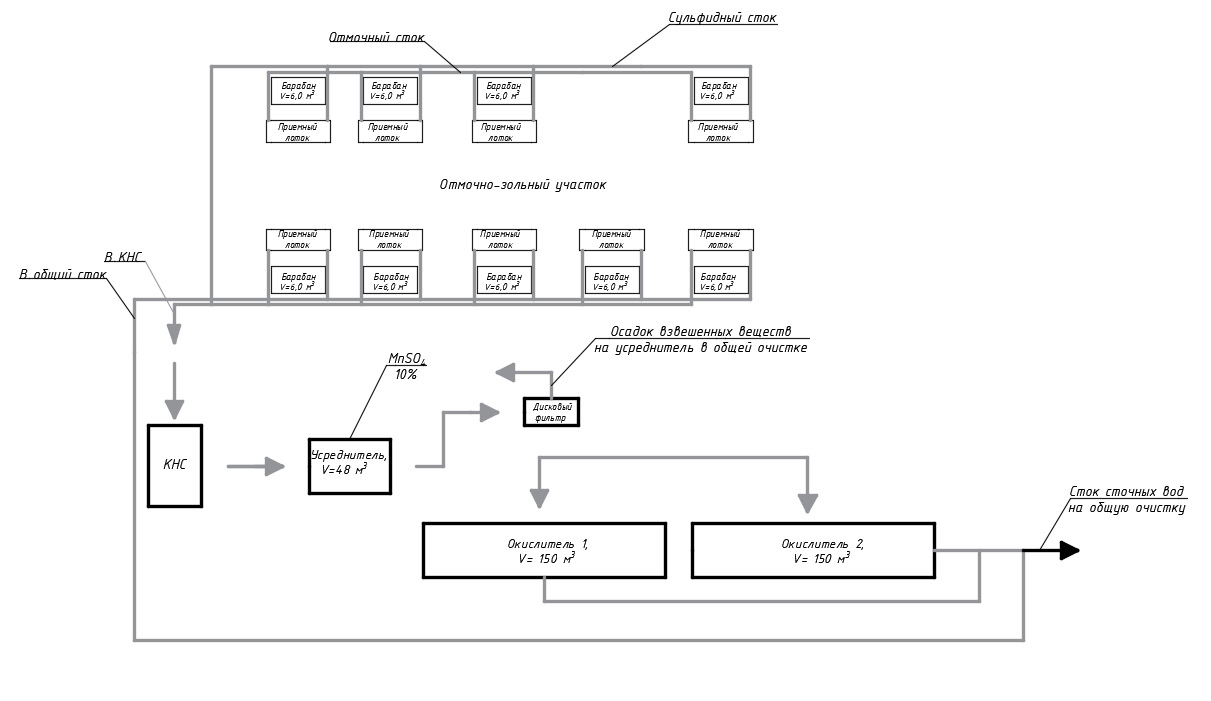 Стоки по канализационной линии отведения сульфидных стоков от 9 барабанов (объем каждого 6,0 м3) отмочно-зольного участка самотеком поступают в канализационную насосную станцию. Отсюда в автоматическом режиме происходит перекачка в усредняющую ёмкость объемом 48 м3.