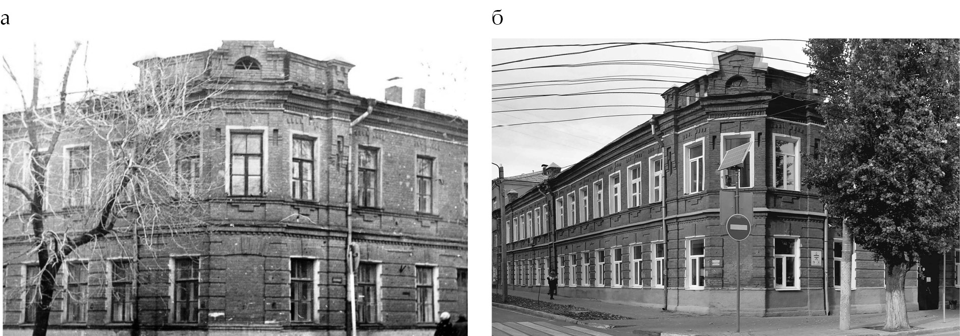 Рис. 6. Училищный дом, г. Воронеж, ул. Пушкинская, 16: а – архивное фото 1992 г.; б – современное фото Е.А. Чернышевой, октябрь 2020 г.