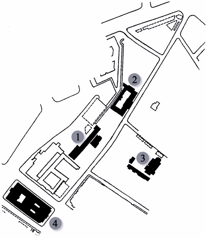 Fig. 1. Nikolskaya Street area. Places of work of scientists. XVII–XVIII centuries. (against the background of fragments of an existing building): 1 – Spasskaya school (1665-1668), Slavic-Latin school (1682-1687), Slavic-Greek-Latin Academy (opened 1687); 2 – Printing School (1681–1687); 3 – Epiphany School (1685–1687); 4 – Main pharmacy (1700–1754)