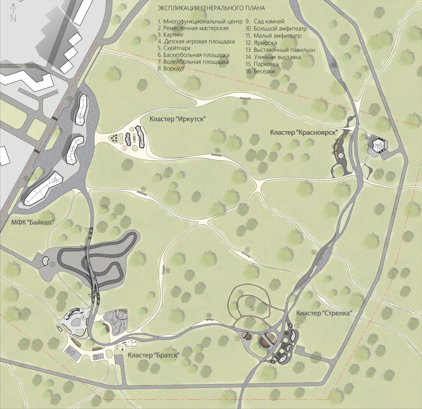 Проектом предлагается комплекс тематических кластеров, вдохновлённых городами Красноярск, Братск и Иркутск, расположенными на берегу Енисея и Ангары. В честь этих рек названы пешеходные тропы, соединяющие кластеры, в честь озера Байкал ‒ многофункциональный комплекс, «Стрелка» ‒ место соединения Ангары и Енисея [8].