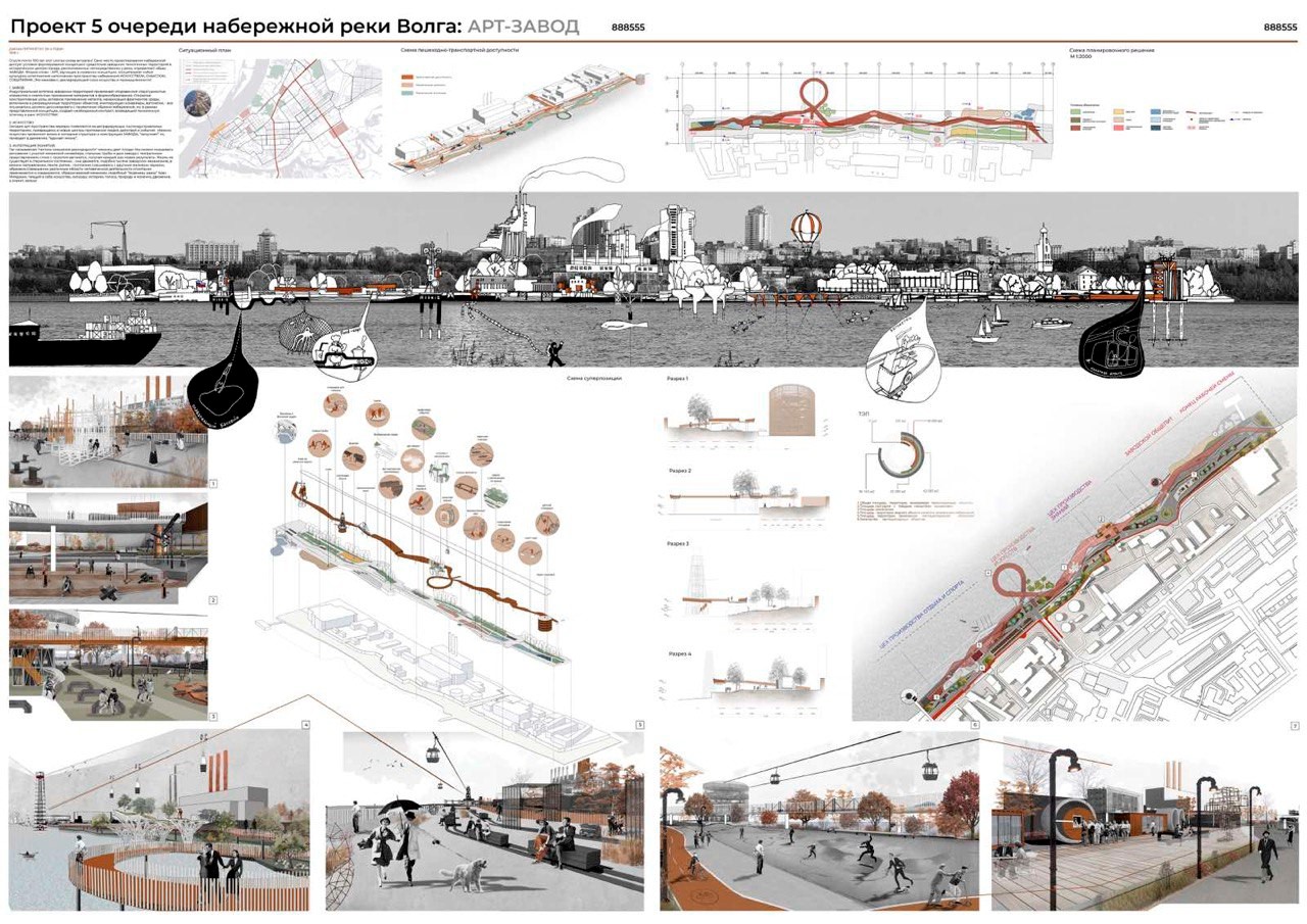 Fig. 4. Project of the fifth stage of the Volga river embankment in Samara. Concept “Art Factory.” Performed by: Smolenskaya E.O., Zaslavskaya A.Yu., Temnikova E.A., Chigrina A.O., Evstratova E.A., Prokhorova V.S., Shmelkova M.A.