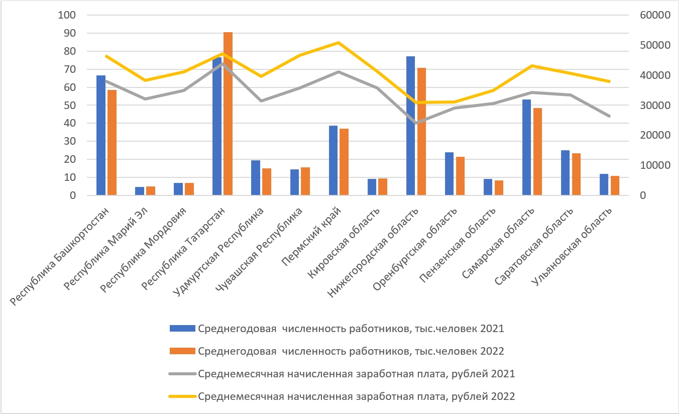Fig. 2. Dynamics of growth in the average annual number and nominal accrued wages in construction in the Volga Federal District in 2021 and 2022. Compiled by the authors according to operational data from Rosstat https://rosstat.gov.ru/folder/14458