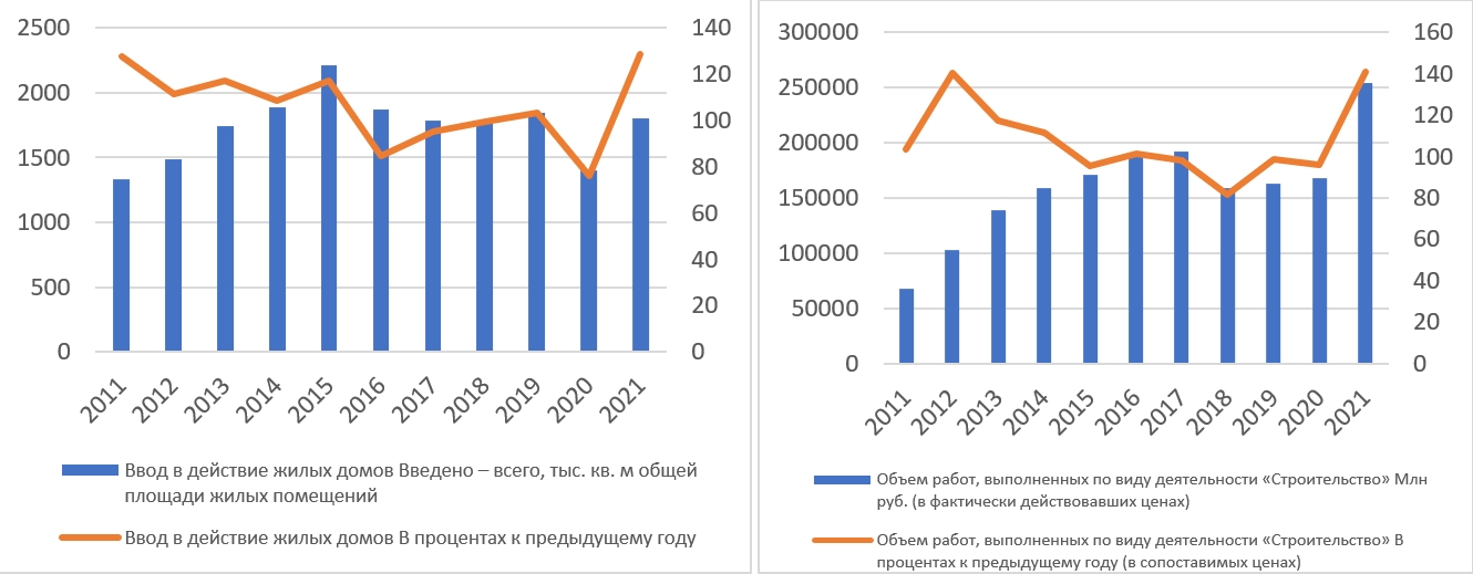 Fig. 3. Commissioning of residential buildings and the volume of work performed by the type of activity “Construction” in the Samara region. Compiled by the authors according to the Samara Statistical Yearbook, https://63.rosstat.gov.ru/construction