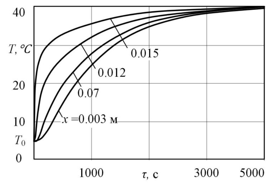 На рис. 4 приведен график распределения температурных кривых во времени в пористой пластине. Характер нагрева существенно отличается. Так, максимальная интенсивность нагрева (dT(x,τ) / dτ) наблюдается на поверхности и уменьшается в направлении к центру пластины.