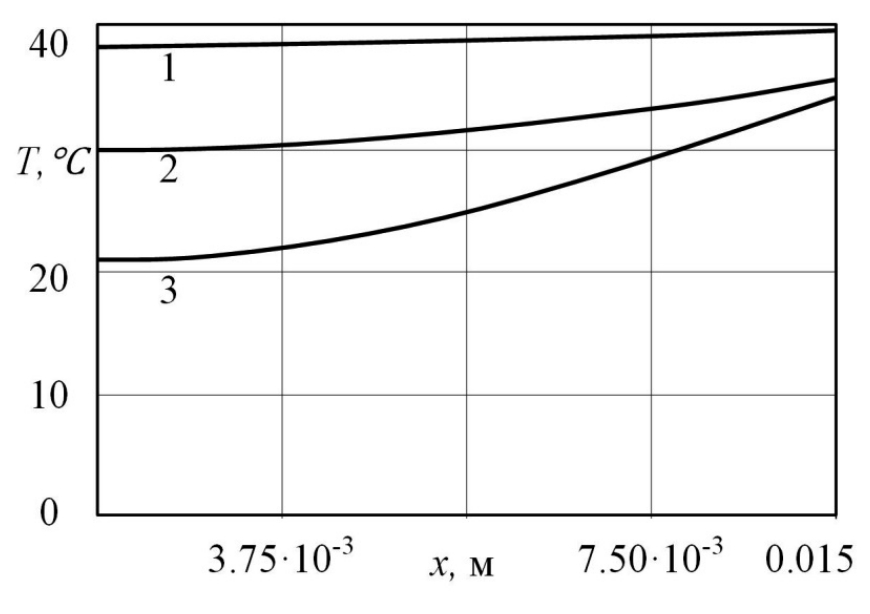 На рис. 6 приведены графики распределения температуры в момент времени τ = 1000 с в пористой пластине, изготовленной из трех различных материалов. Так, линия 1 соответствует материалу – пенополистирол фирмы «Пеноплекс»: теплоемкость – 1600 Дж/(кгК), плотность – 43 кг/м3, теплопроводность – 0,03 Вт/(мК); линия 2 – фотополимерная смола фирмы «Phrozen»: теплоемкость – 800 Дж/(кгК), плотность – 1412 кг/м3, теплопроводность – 0,375 Вт/(мК), линия 3 – пластик PETG (теплофизические свойства представлены выше). Из анализа данного графика следует, что температура пластины, соответствующая пластику PETG, оказывается ниже во всем диапазоне x, чем для пенополистирола и фотополимерной смолы в аналогичный момент времени.
