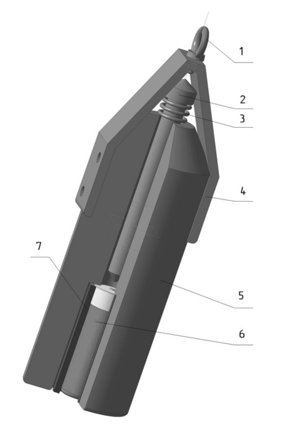 Устройство на рис.1 содержит: 1 – рым-болт; 2 – ударник-накольник; 3 ‒ пружина сжатия; 4 ‒ крепёжная наружная скоба; 5 – корпус изделия; 6 ‒ ружейный патрон с пулевым зарядом; 7 – вкладыш. Рым-болт выполнен под трос или вытяжной шнур. Масса ударника-накольника 200 г. Наружная крепёжная скоба выполняет функцию ограничителя хода ударника на (М8-М12)х4 болта. Устройство применяется для ружейного патрона с пулевым зарядом или гладкоствольным «жаканом». Вкладыш представляет собой отрезок трубы 3/4 ‘, увеличивающего срок службы самого изделия. Его применение возможно, но не обязательное. Корпус изделия имеет массу 5‒7 кг. Диаметр – относительный размер, определяется по месту и прочности на разрыв.
