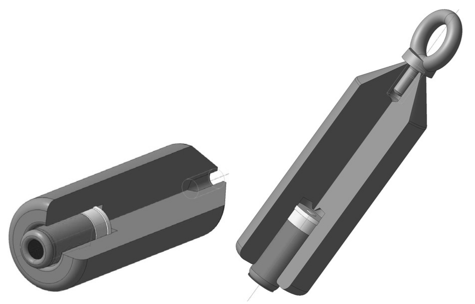 В устройстве, показанном на рис. 3, ударников нет. Капсюль накалывает корпус изделия, или используются дополнительные сменные накольники. Патрон торцом выступает вперёд за пределы изделия (5‒10 мм) и первым ударяется о дно, на него сверху надвигается корпус. При достижении каменного дна скважины выступающим торцом патрона изделие всем весом само продолжает инерционно наезжать на патрон, пока не надавит на капсюль центральным выступом-накольником. Преимущество такой конструкции – предельная простота, надёжность, минимальные стоимость и время изготовления (токарные работы). Недостаток проявляется в том, что от хлопков ожидается изнашивание центрального выступа накольника. В этом случае корпус заново протачивают на токарном станке изнутри со дна патронной полости, обновляя накольный выступ до нормальных размеров и формы. Или же можно изготовить и использовать сменные накольники на резьбе с большой площадью опоры, принимающей удар и сберегающей резьбы (рис. 4). Более предпочтительно выполнить рым-болт на резьбе, а не на сварке. Это обусловлено тем, что сварные швы (имеют в составе смесь разнородных металлов) плохо воспринимают ударную нагрузку, тем более мощные взрывные короткоимпульсные воздействия, а также вибрацию (хотя хорошо работают на сжатие или на разрыв).