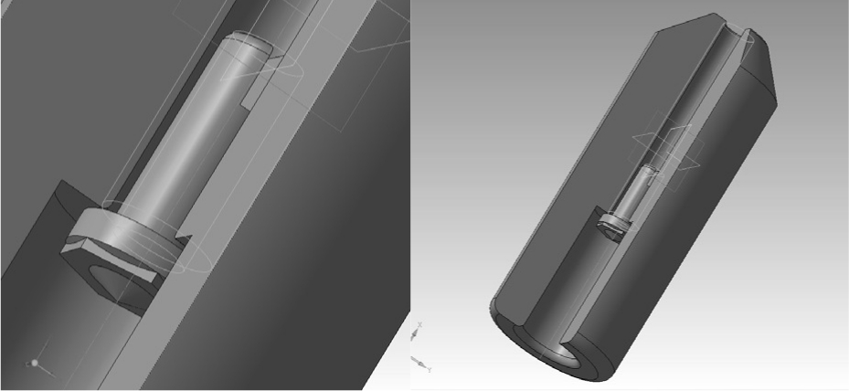 Разработка конструкций. Предложено три вида устройства с различными способами механической инициации-накола капсюля патрона (рис. 1‒3). Все три принципа срабатывания – механические инерционные ударные в разном конструктивном исполнении. Возможна дополнительная втулка «патронник» как вкладыш в изделие. На рис. 1 и 3 срабатывание патрона неуправляемое моментальное, где сброс в скважину и накол – одна операция. Если изделие полетело вниз, то само сработает, ударившись патроном о каменистое дно скважины.