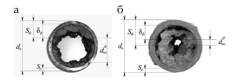Рис. 1. Слой отложений на внутренней поверхности водопроводных труб: а ‒ стальных; б ‒ чугунных
